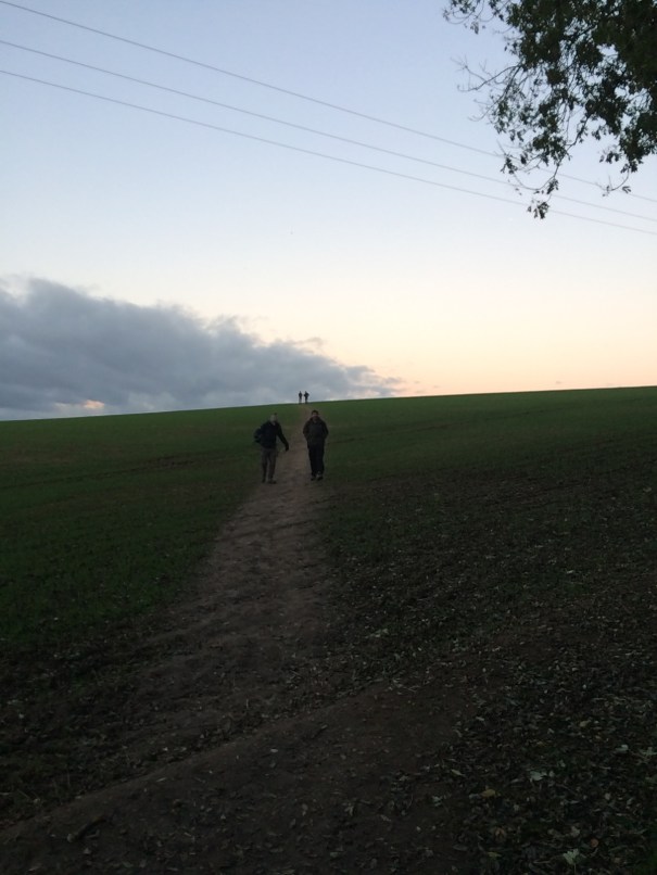 We spot some sort of strange and massive grey stone sculpture that looks like a cross between stacked pieces of Stone Henge and Tetris blocks, and no one knows what it is. Further on, there’s some sort of church at either Remenham or Medmenham, and it’s bizarrely placed at the peak of the hill we’re walking along, just like the sculpture. You can’t really see it below (top right), because as the sun was beginning to set, the sky took on this absolutely stunning silverish sheen that lent everything this sort of profound air and a feeling I can’t quite articulate.