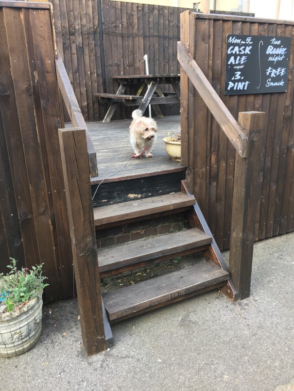 We take the opportunity to scoff down lunch with pint 2 (official, it’s several more for a few of our number) and then head off. Clyde and I nip to the loo before joining the others and on the way back I clock this ridiculously cute puppy I’d seen earlier but not had the chance to introduce myself to. It’s one of those tiny ones who’s scared of everyone until it sniffs them and then it’s immediately your best friend.