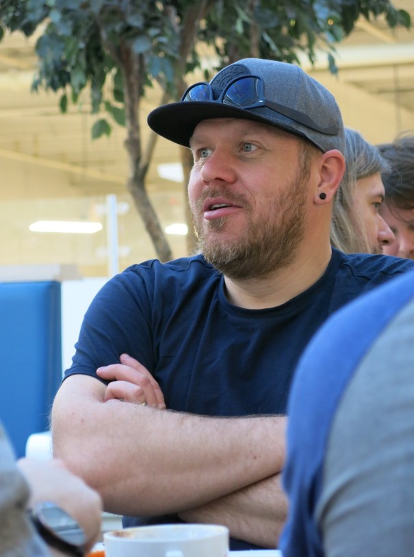 I forgot Mat has a dodgy knee, and with the trouser leg gone I can see his knee brace, which is some heavy tech, full of metal.